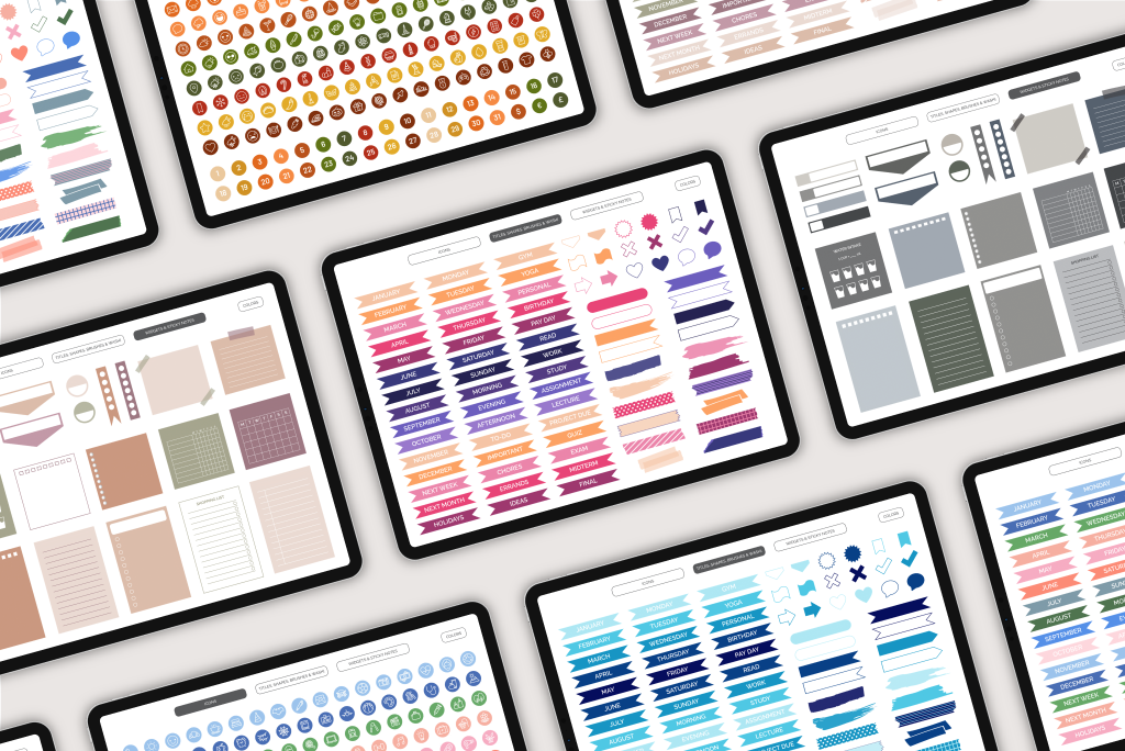 This sticker pack comes with over 1800+ stickers! It includes labels, sticky notes emojis, washi tape stickers and everything you could dream of.