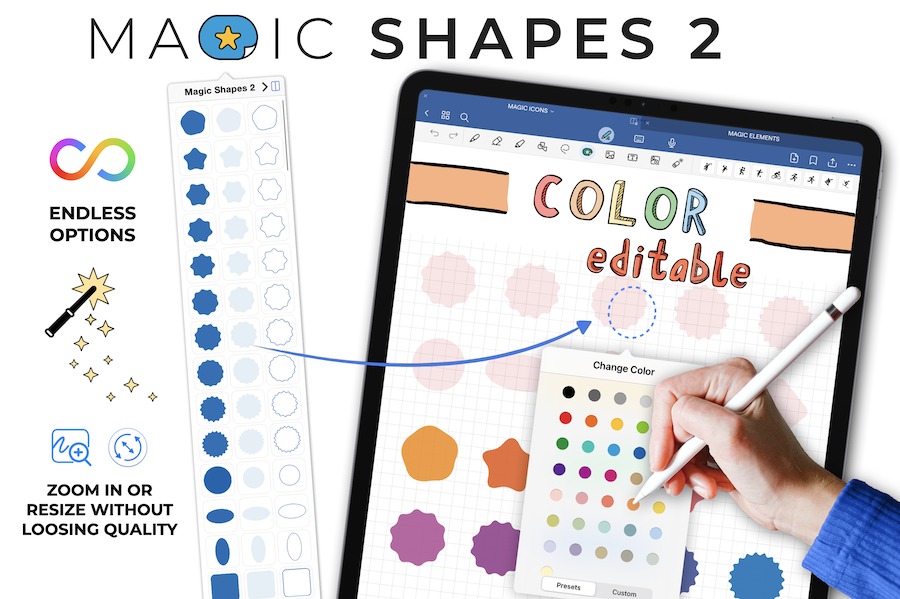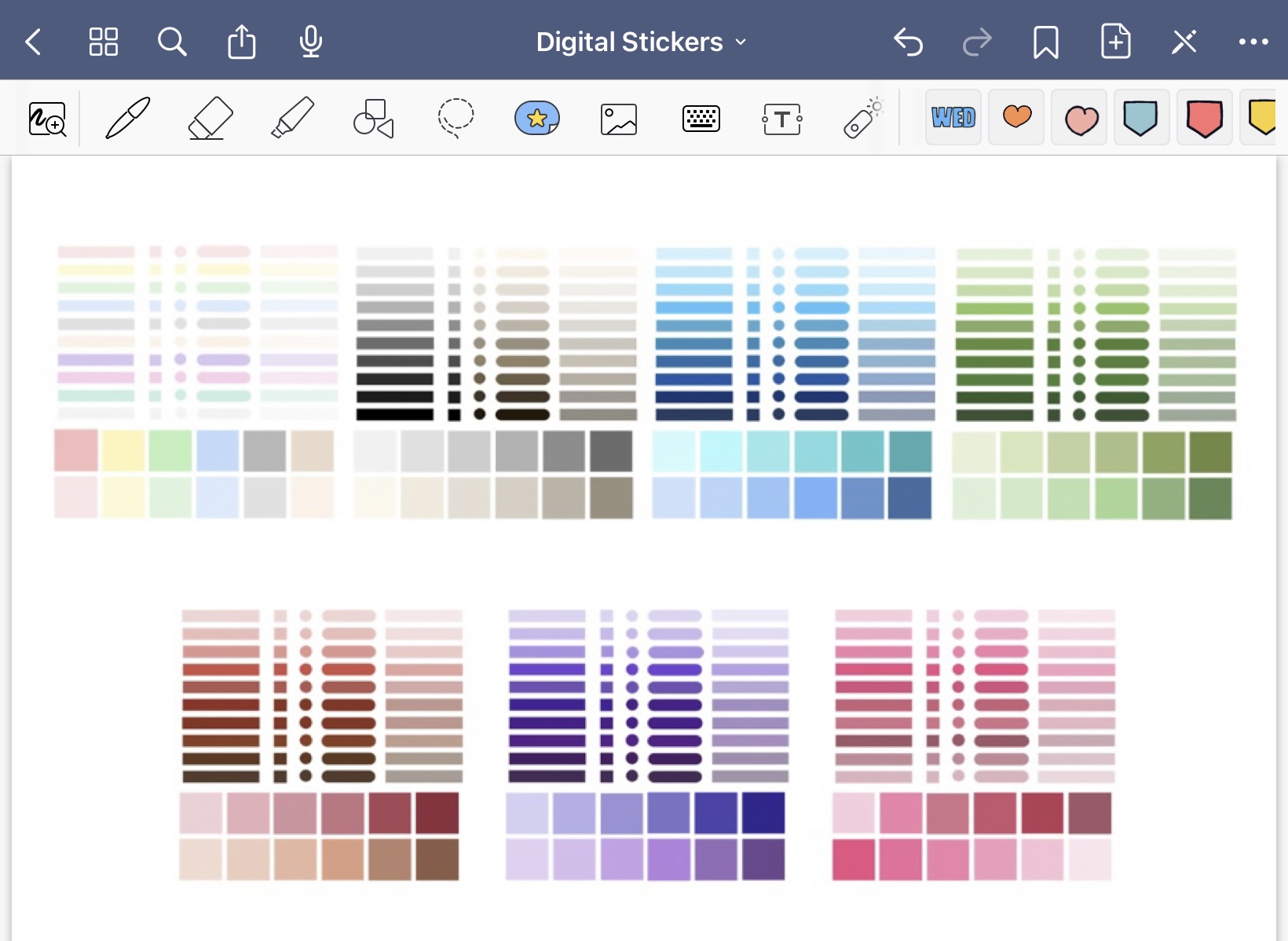 一体何が「マジック」? 簡単に言うと、Goodnotes内でこれらのステッカーの色を変更できること。 つまり、14種類の形のステッカーパックを1つ購入すると、14の形を全色で利用できるのです。