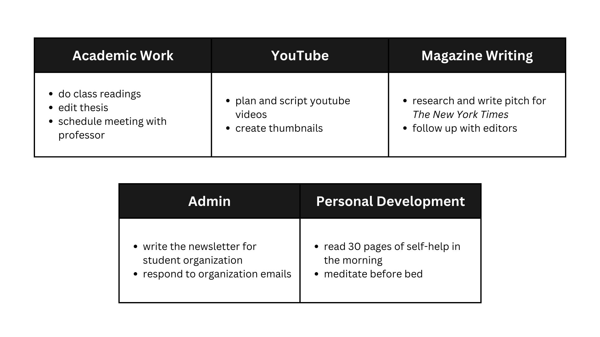 - Categorize Tasks: List everything you need to do for the day and group similar tasks together.